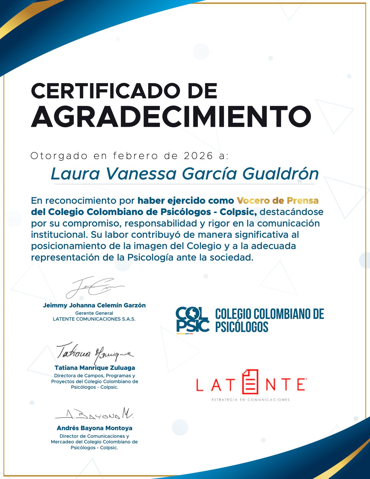 Actualmente soy representante del Colegio Colombiano de Psicólogos (campo salud) y vocera para la opinión pública del país.
